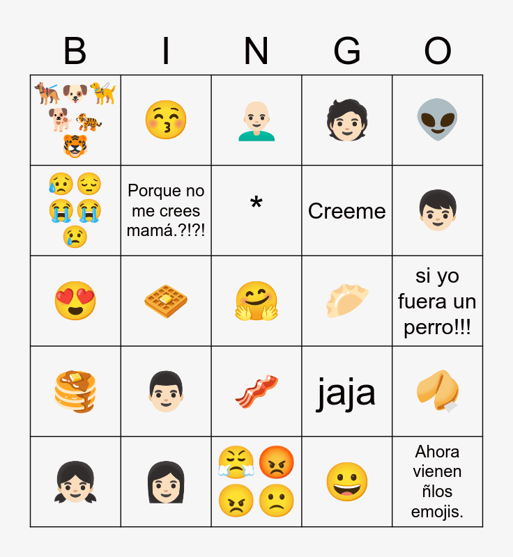 This bingo card has a free space and 34 words: El choclo es pesado con migo, Eleonore, Tรบ crees que es una gua gua, pero con migo se porta como, si yo fuera un perro!!!, ๐ฅ๐๐ญ๐ญ๐ข, Porque no me crees mamรก.?!?!, ๐ค๐ก๐ ๐, Creeme, Ahora vienen รฑlos emojis., ๐, ๐, ๐, ๐ฅจ, ๐ฅ, ๐ง, ๐ฅ, ๐ฅ, ๐ฅ , ๐ง๐ป, ๐ฉ๐ป, ๐ง๐ป, ๐ง๐ป, ๐ฆ๐ป, ๐ฉ๐ปโ๐ฆณ, ๐จ๐ป, ๐จ๐ปโ๐ฆฒ, ๐จ๐ปโ๐ฆณ, ๐ฝ, ๐โ๐ฆบ๐ถ๐ฆฎ๐๐ ๐ฏ, @, *, jaja and jmdncjbm.