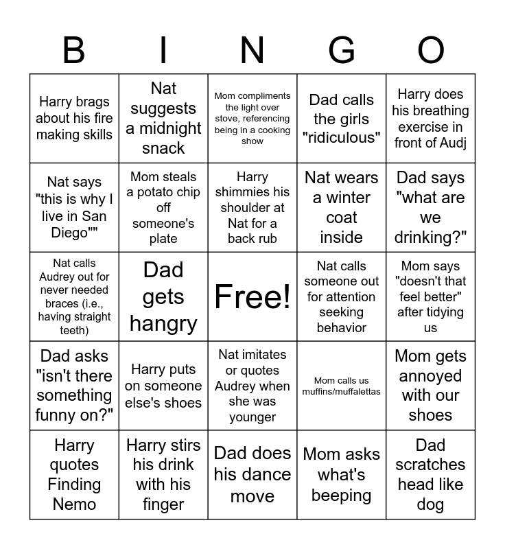 This bingo card has a free space and 24 words: Harry puts on someone else's shoes, Harry stirs his drink with his finger, Harry shimmies his shoulder at Nat for a back rub, Harry quotes Finding Nemo, Harry does his breathing exercise in front of Audj, Harry brags about his fire making skills, Nat says "this is why I live in San Diego"", Nat suggests a midnight snack, Nat calls someone out for attention seeking behavior, Nat imitates or quotes Audrey when she was younger, Nat wears a winter coat inside, Nat calls Audrey out for never needed braces (i.e., having straight teeth), Mom calls us muffins/muffalettas, Mom gets annoyed with our shoes, Mom steals a potato chip off someone's plate, Mom asks what's beeping, Mom says "doesn't that feel better" after tidying us, Mom compliments the light over stove, referencing being in a cooking show, Dad says "what are we drinking?", Dad gets hangry, Dad scratches head like dog, Dad asks "isn't there something funny on?", Dad calls the girls "ridiculous" and Dad does his dance move.