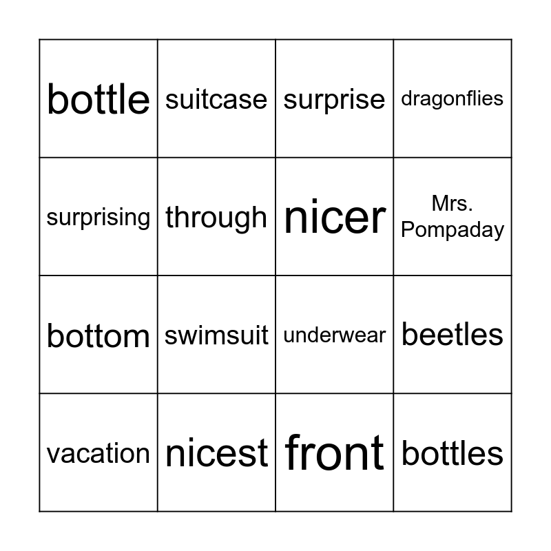 This bingo card has 16 words: nicest, beetles, surprise, bottle, bottom, suitcase, underwear, front, surprising, through, vacation, dragonflies, swimsuit, Mrs. Pompaday, nicer and bottles.