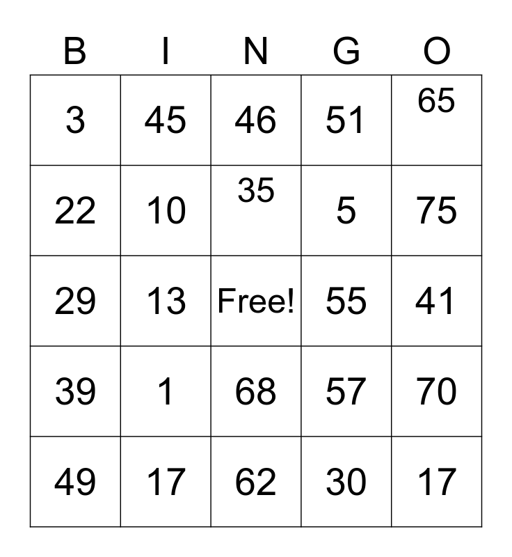 This bingo card has a free space and 24 words: 1, 17, 35, 49, 65, 3, 22, 45, 55, 68, 5, 29, 57, 70, 10, 30, 41, 46, 75, 13, 17, 39, 51 and 62.