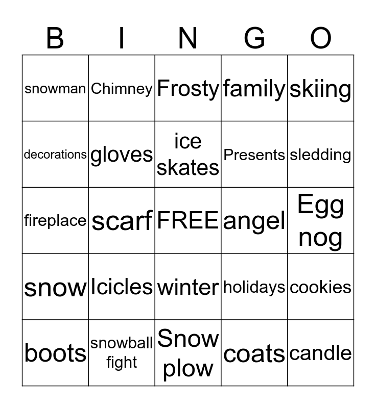 This bingo card has a free space and 35 words: joy, feast, New Years, gloves, winter, family, decorations, hot chocolate, ice skates, coal, fireplace, skiing, snow days, tree, snowman, angel, coats, scarf, snow, candle, holidays, boots, cookies, snowball fight, Frosty, sledding, Lights, Peace, Presents, Egg nog, Cards, Snow plow, Icicles, Chimney and Celebrate.