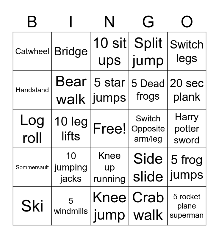 This bingo card has a free space and 24 words: 10 jumping jacks, 5 windmills, 5 star jumps, Ski, Switch legs, Catwheel, Handstand, Bridge, Switch Opposite arm/leg, Knee up running, 5 Dead frogs, Log roll, Side slide, 5 frog jumps, Bear walk, Crab walk, Harry potter sword, 10 sit ups, 20 sec plank, 10 leg lifts, 5 rocket plane superman, Sommersault, Split jump and Knee jump.