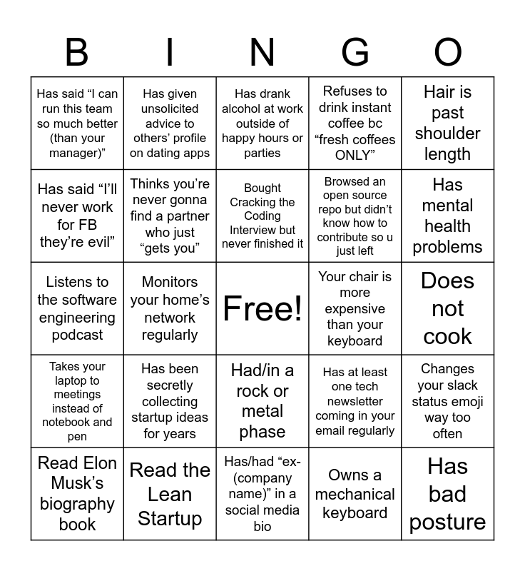 This bingo card has a free space and 24 words: Has been secretly collecting startup ideas for years, Read the Lean Startup, Bought Cracking the Coding Interview but never finished it, Read Elon Musk’s biography book, Hair is past shoulder length, Has said “I can run this team so much better (than your manager)”, Has said “I’ll never work for FB they’re evil”, Has given unsolicited advice to others’ profile on dating apps, Your chair is more expensive than your keyboard, Had/in a rock or metal phase, Browsed an open source repo but didn’t know how to contribute so u just left, Listens to the software engineering podcast, Has at least one tech newsletter coming in your email regularly, Changes your slack status emoji way too often, Thinks you’re never gonna find a partner who just “gets you”, Owns a mechanical keyboard, Does not cook, Has drank alcohol at work outside of happy hours or parties, Has mental health problems, Monitors your home’s network regularly, Has bad posture, Takes your laptop to meetings instead of notebook and pen, Refuses to drink instant coffee bc “fresh coffees ONLY” and Has/had “ex-(company name)” in a social media bio.