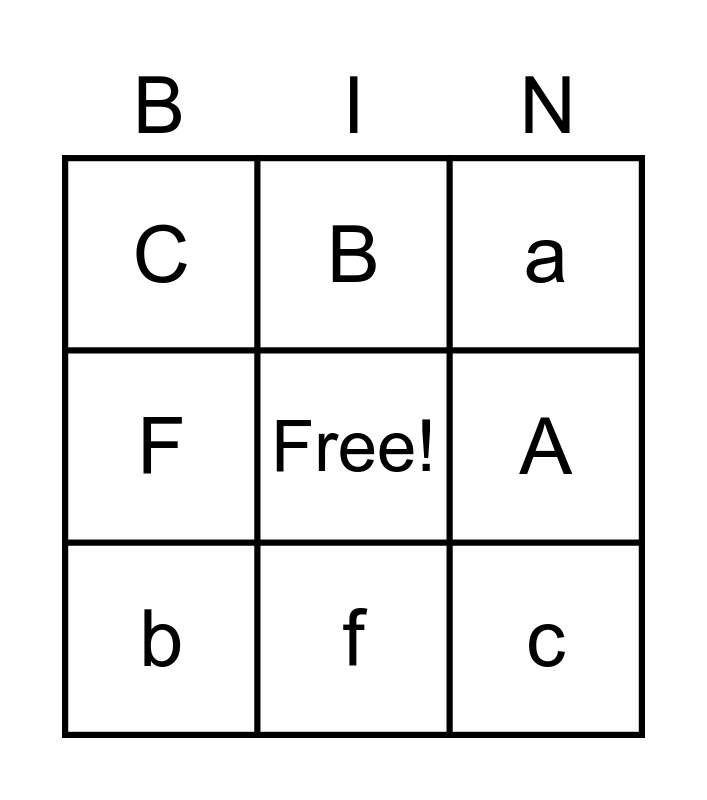 This bingo card has a free space and 8 words: A, a, B, b, C, c, F and f.