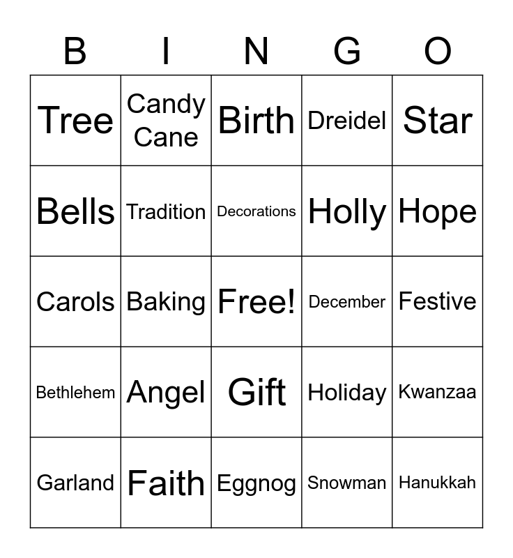 This bingo card has a free space and 25 words: Angel, Eggnog, Decorations, Garland, Star, Tree, Bells, Candy Cane, December, Gift, Holly, Carols, Holiday, Kwanzaa, Tradition, Feast, Festive, Birth, Hope, Baking, Hanukkah, Faith, Bethlehem, Dreidel and Snowman.