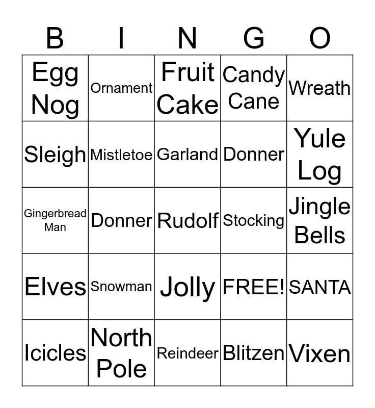This bingo card has 25 words: Snowman, Reindeer, Garland, Icicles, Wreath, Egg Nog, Sleigh, Ornament, Stocking, Jolly, Donner, Gingerbread Man, FREE!, SANTA, Mistletoe, Vixen, Jingle Bells, Fruit Cake, Yule Log, Donner, Rudolf, North Pole, Elves, Candy Cane and Blitzen.