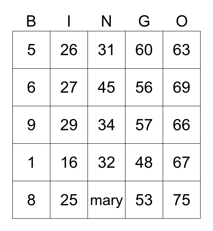 This bingo card has 25 words: 1, 25, 34, 53, 63, 5, 26, 31, 57, 67, 6, 27, mary, 48, 69, 8, 29, 45, 56, 66, 9, 16, 32, 60 and 75.