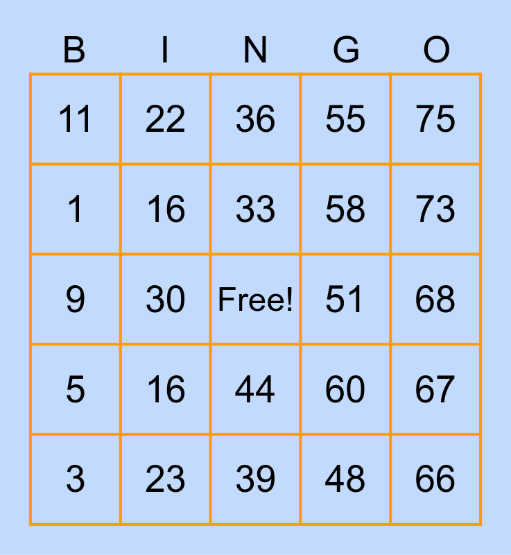 This bingo card has a free space and 24 words: 3, 16, 33, 48, 75, 11, 22, 36, 51, 68, 9, 16, 60, 67, 1, 23, 39, 55, 73, 5, 30, 44, 58 and 66.