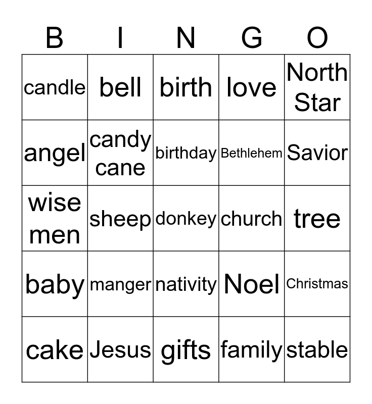 This bingo card has a free space and 24 words: manger, Jesus, birthday, cake, North Star, candle, angel, bell, church, nativity, Bethlehem, wise men, Noel, Christmas, candy cane, family, tree, birth, Savior, sheep, stable, baby, love and gifts.