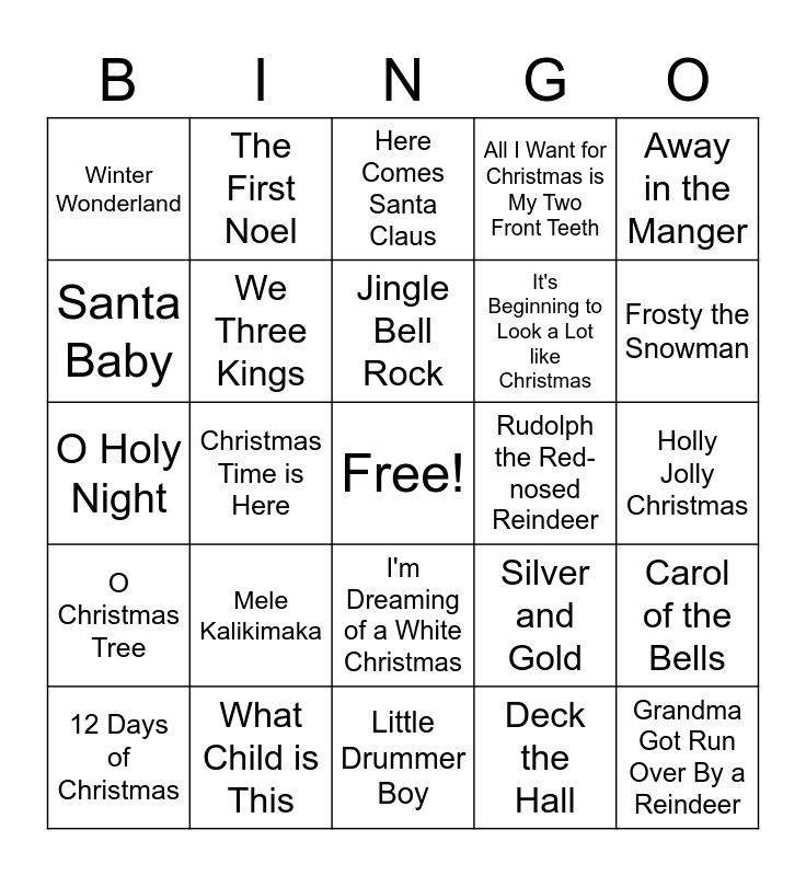 This bingo card has a free space and 34 words: Jingle Bells, Deck the Hall, Sleigh Ride, I Want a Hippopotamus for Christmas, O Christmas Tree, We Three Kings, Away in the Manger, 12 Days of Christmas, The First Noel, Rockin' Around the Christmas Tree, Jingle Bell Rock, Here Comes Santa Claus, Up on the Housetop, Santa Claus is Coming to Town, Rudolph the Red-nosed Reindeer, Frosty the Snowman, What Child is This, O Holy Night, Mele Kalikimaka, Silver and Gold, I'm Dreaming of a White Christmas, Let it Snow!, Winter Wonderland, Holly Jolly Christmas, Little Drummer Boy, Grandma Got Run Over By a Reindeer, All I Want for Christmas is My Two Front Teeth, Blue Christmas, It's Beginning to Look a Lot like Christmas, Santa Baby, You're a Mean One Mr. Grinch, Christmas Time is Here, Carol of the Bells and All I want for Christmas is You..