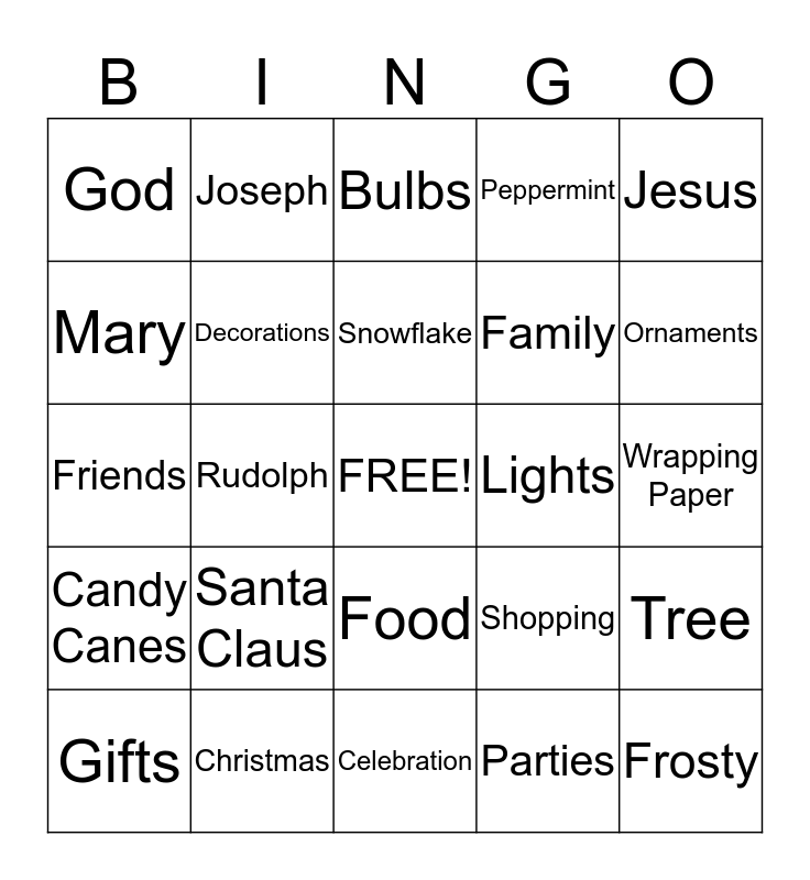 This bingo card has a free space and 24 words: Santa Claus, Christmas, Snowflake, Gifts, Jesus, God, Mary, Joseph, Lights, Food, Family, Friends, Shopping, Tree, Decorations, Parties, Wrapping Paper, Bulbs, Ornaments, Rudolph, Frosty, Candy Canes, Peppermint and Celebration.