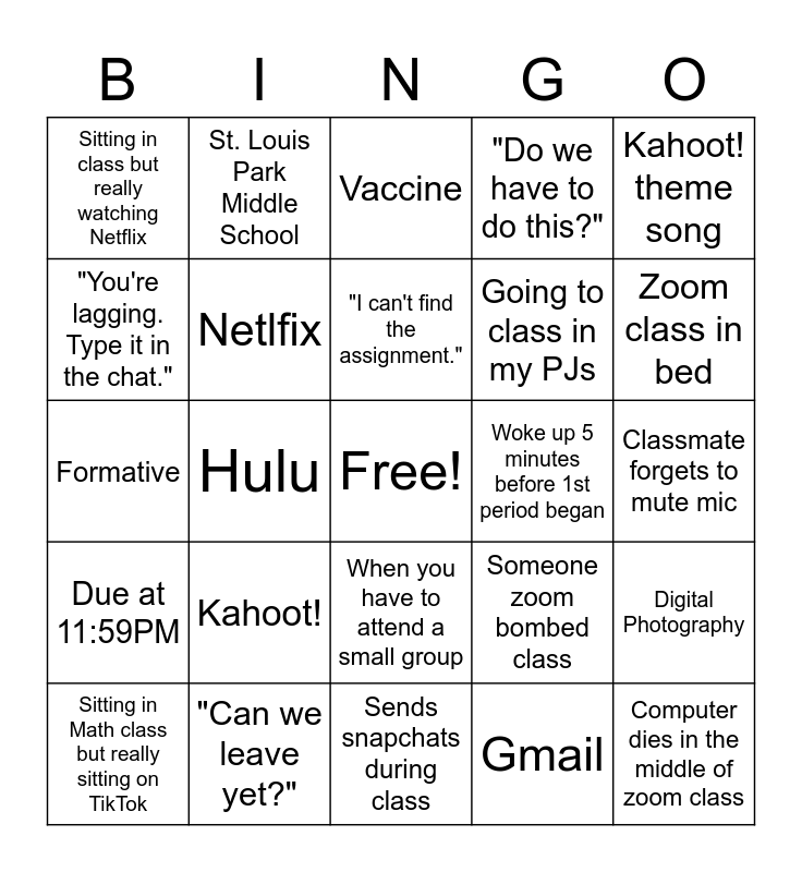 This bingo card has a free space and 54 words: "Can we play Among Us?", Due at 11:59PM, Teacher asks everyone to turn on camera, Left zoom class early, When you have to attend a small group, Teacher says, "Let me share my screen.", "Do we have to do this?", Email teacher with questions at midnight, "You're lagging. Type it in the chat.", Turns camera on to show family pet, Sitting in class but really watching Netflix, Classmate spams the chat, "Can we leave yet?", Sitting in Math class but really sitting on TikTok, Teacher forgot to unmute themselves, Sends snapchats during class, Computer dies in the middle of zoom class, Going to class in my PJs, When the breakout room is extra awkward, Classmate forgets to mute mic, Someone zoom bombed class, When you don't have any INC assignments, Woke up 5 minutes before 1st period began, Kahoot! theme song, Chromebook, St. Louis Park Middle School, COVID-19, Distance Learning, Schoology, Gmail, Advisory, Hybrid, Winter Break, Face mask, Vaccine, Summative, Formative, Digital Photography, Snow, Netlfix, Social Distancing, Hand Sanitizer, Zoom, Google Meets, Kahoot!, Breakout Rooms, Facetime, 6 feet apart, "I can't find the assignment.", Hulu, Zoom class in bed, Pandemic, Quarantine and Curbside Pickup.