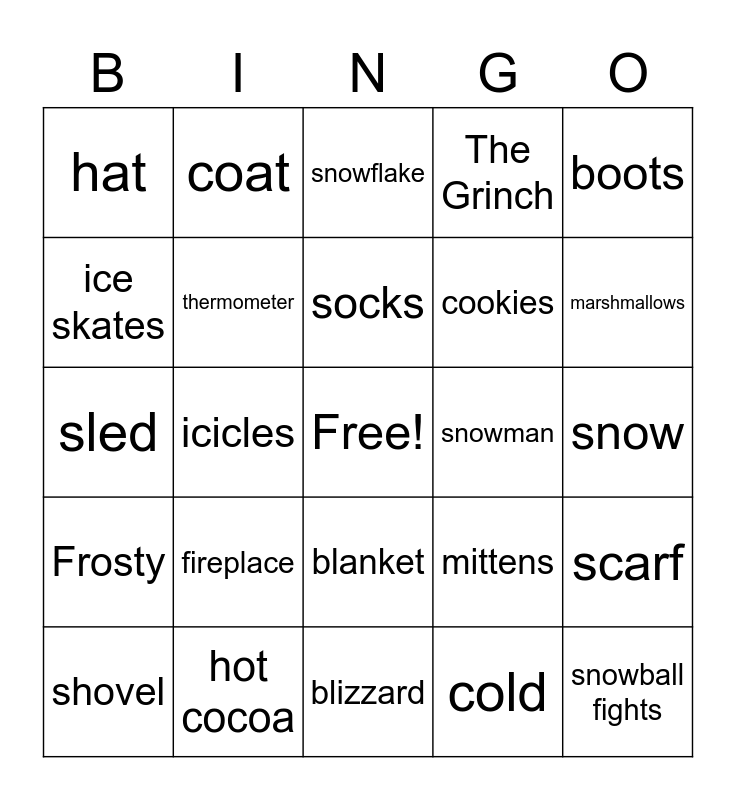 This bingo card has a free space and 24 words: fireplace, hot cocoa, socks, shovel, boots, hat, ice skates, coat, snowman, blanket, cookies, sled, mittens, scarf, thermometer, cold, snow, snowflake, marshmallows, icicles, snowball fights, Frosty, The Grinch and blizzard.