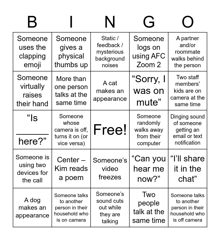 This bingo card has a free space and 25 words: Center – Kim reads a poem, Someone’s sound cuts out while they are talking, A cat makes an appearance, A dog makes an appearance, A partner and/or roommate walks behind the person, Someone uses the clapping emoji, Someone virtually raises their hand, Someone gives a physical thumbs up, Someone randomly walks away from their computer, Someone’s video freezes, “Sorry, I was on mute”, “Is ______ here?”, “Can you hear me now?”, “I’ll share it in the chat”, More than one person talks at the same time, Someone disappears into their virtual background, Dinging sound of someone getting an email or text notification, Static / feedback / mysterious background noises, Two staff members' kids are on camera at the same time, Someone whose camera is off, turns it on (or vice versa), Someone talks to another person in their household who is off camera, Someone talks to another person in their household who is on camera, Someone is using two devices for the call, Someone logs on using AFC Zoom 2 and Two people talk at the same time.