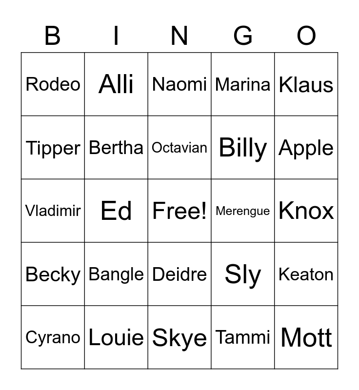 This bingo card has a free space and 24 words: Bangle, Louie, Octavian, Cyrano, Klaus, Rodeo, Tipper, Alli, Merengue, Deidre, Billy, Vladimir, Sly, Keaton, Bertha, Tammi, Knox, Naomi, Apple, Ed, Mott, Becky, Marina and Skye.