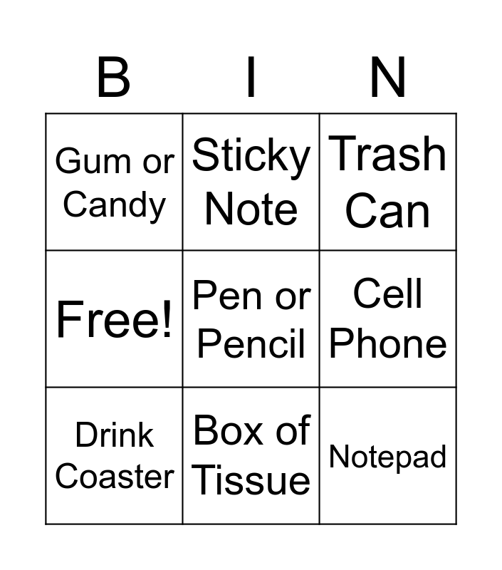 This bingo card has 10 words: Box of Tissue, Trash Can, Gum or Candy, Pen or Pencil, Free!, Drink Coaster, Sticky Note, Water Bottle, Cell Phone and Notepad.
