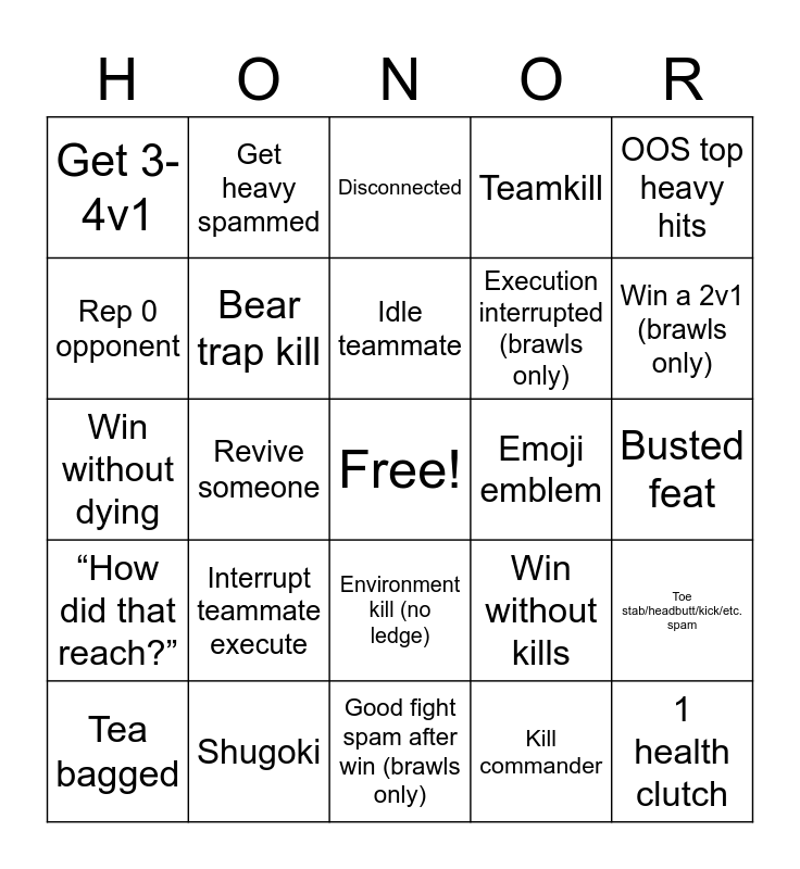 This bingo card has a free space and 72 words: Get light spammed, Get heavy spammed, Revive someone, Be revived, Ledge someone, Be ledged, Teamkill, Be team killed, Execution interrupted (brawls only), Edge walked on, Tea bagged, Get 2v1 (brawls only), Win a 2v1 (brawls only), Get 3-4v1, Win 3-4v1, Win without dying, Win without kills, OOS top heavy hits, Double kill, Busted feat, Interrupt teammate execute, 1 health clutch, Toe stab/headbutt/kick/etc. spam, Perfected, Kill stolen, Steal a kill, Musical emote, Make friends, Gryphon, Hitokiri, Shugoki, Dodge attack spam, Aerial kill, Zone twice kill, Kill commander, Kill guardian, Break ram, Rep 70 opponent, Rep 0 opponent, Teammate runs from revenge, Environment kill (no ledge), Teammate leaves (brawls only), Opponent rage quits (brawls only), Accidental kill, ballista kill, “How did that reach?”, Revenge zone spam, Get clapped / slammed all match, Black prior double flip, Orochi heavy deflect, Bite interrupted by teammate, Long arm (brawls only), Offensive emblem, Emoji emblem, Weeb emblem, Lag, Disconnected, Idle teammate, Go random (4v4 only), Get revenge, don’t use it, win, Death by hyper armor, Throwable kill (kunai, axe, hammer, etc.), All boosts (Shield, attack, speed), Good fight spam after win (brawls only), Opponent parries everything, Heelys, Bear trap kill, Get messaged, Turn off HUD, Do lap (4v4 only), Nuxia and Faraam Clutch (4v4 only).