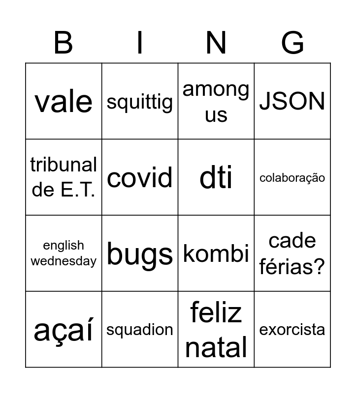 This bingo card has 28 words: pipoquinhas, iam, english wednesday, curupira, covid, among us, squittig, exorcista, squadion, coleção de mouse, kombi, JSON, divo, consagrados, bugs, cade vacina?, parceria, dti, colaboração, corujas, vale, crossfit, açaí, cade férias?, feliz natal, cervejinha, tribunal de E.T. and bom humor.