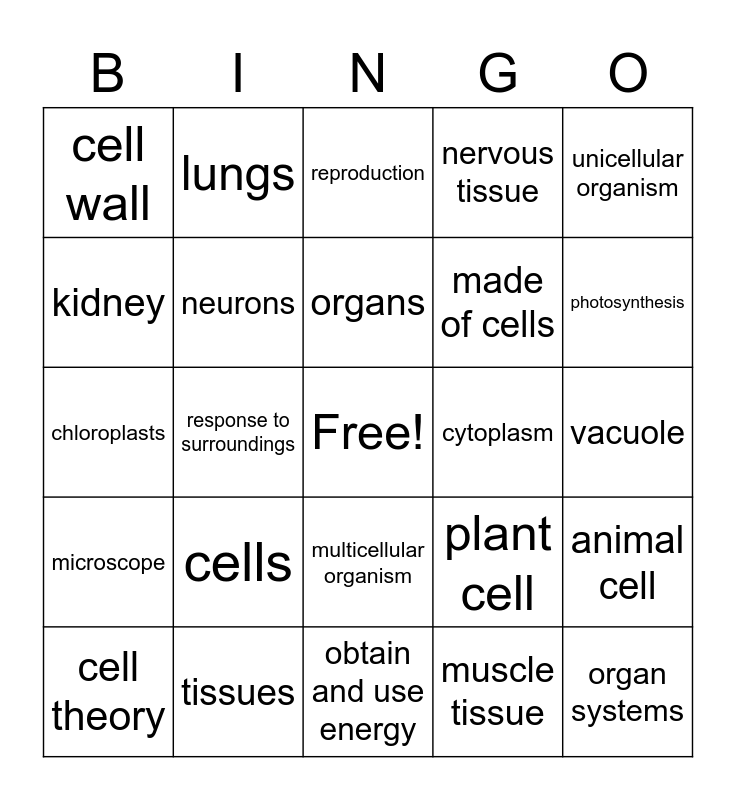 This bingo card has a free space and 24 words: cells, tissues, organs, cell theory, unicellular organism, cell wall, kidney, lungs, cytoplasm, multicellular organism, made of cells, chloroplasts, plant cell, animal cell, neurons, muscle tissue, vacuole, reproduction, photosynthesis, response to surroundings, organ systems, microscope, nervous tissue and obtain and use energy.