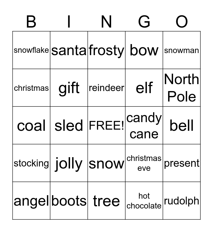 This bingo card has a free space and 24 words: jolly, boots, reindeer, angel, snowman, snowflake, christmas, santa, candy cane, snow, elf, coal, christmas eve, present, gift, hot chocolate, bell, frosty, North Pole, sled, rudolph, stocking, bow and tree.