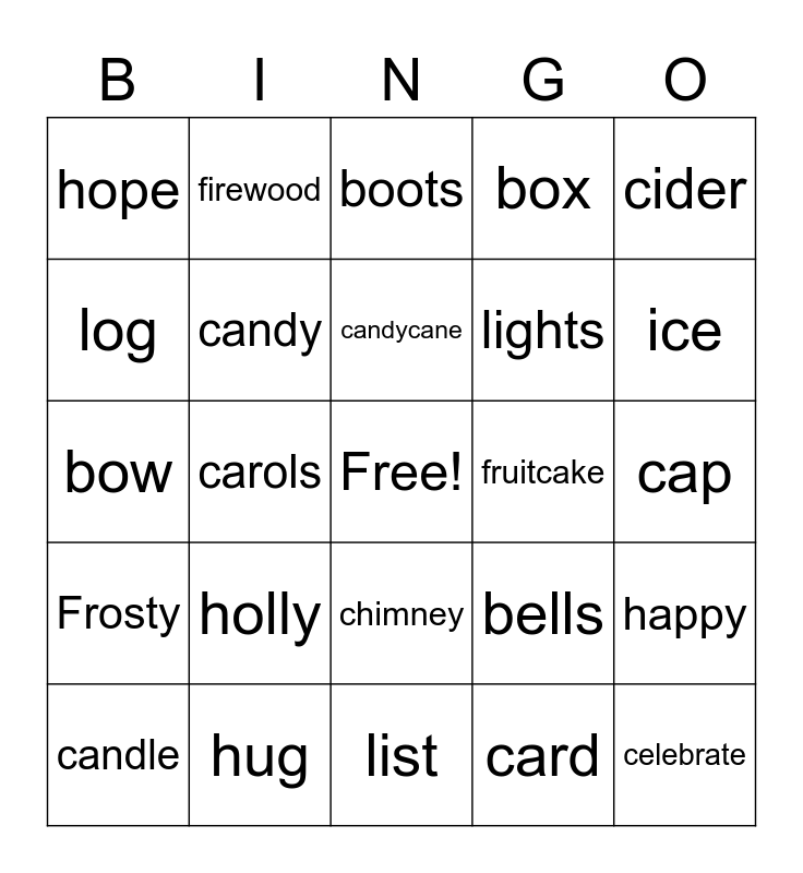 This bingo card has a free space and 27 words: bells, blizzard, lights, list, log, boots, firewood, Frosty, fruitcake, happy, bow, box, candle, hug, ice, icicle, candy, candycane, holly, hope, cap, card, carols, celebrate, chimney, cider and coal.
