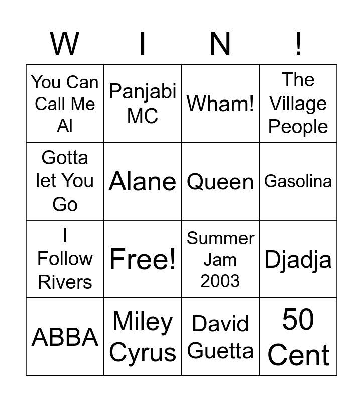This bingo card has 18 words: Free!, 50 Cent, Wham!, You Can Call Me Al, Summer Jam 2003, The Village People, ABBA, Panjabi MC, Gasolina, I Follow Rivers, David Guetta, Gotta let You Go, Djadja, Alane, Queen, I Will Survive, Miley Cyrus and Macarena.