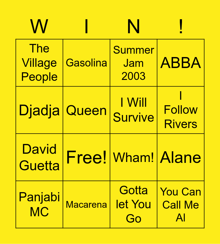 This bingo card has 18 words: Free!, You Can Call Me Al, Summer Jam 2003, The Village People, Wham!, ABBA, Panjabi MC, Gasolina, I Follow Rivers, David Guetta, Gotta let You Go, Djadja, Alane, Queen, I Will Survive, Miley Cyrus, Macarena and 50 Cent.