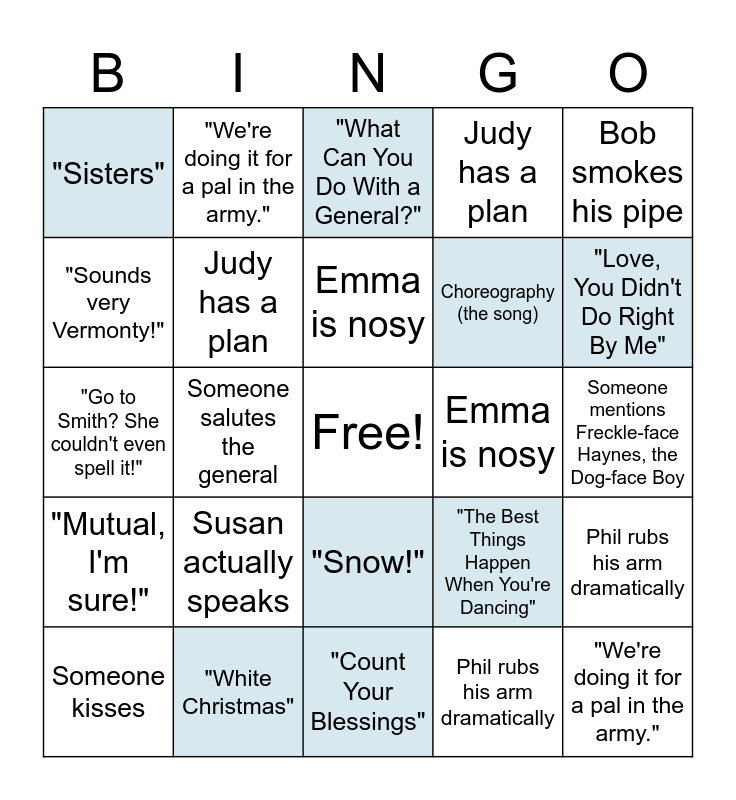 This bingo card has a free space and 29 words: Someone kisses, Betty gets frustrated, Someone salutes the general, "Mandy!", "Sisters", "What Can You Do With a General?", Judy has a plan, Susan actually speaks, Emma is nosy, "White Christmas", Someone mentions Freckle-face Haynes, the Dog-face Boy, "We're doing it for a pal in the army.", "Count Your Blessings", Phil rubs his arm dramatically, "Love, You Didn't Do Right By Me", "I said, 'at ease'!", "Snow!", "Mutual, I'm sure!", Bob smokes his pipe, "Go to Smith? She couldn't even spell it!", "The Best Things Happen When You're Dancing", "Where'd you leave that? In your snood?", Choreography (the song), "Sounds very Vermonty!", Judy has a plan, "We're doing it for a pal in the army.", Phil rubs his arm dramatically, Emma is nosy and Someone salutes the general.