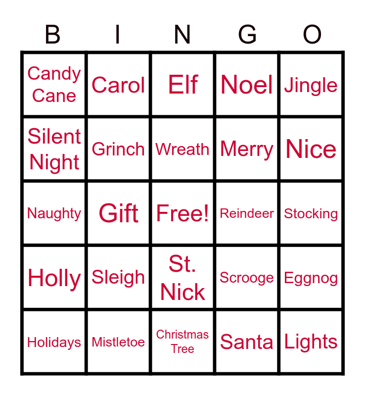 This bingo card has a free space and 29 words: Holidays, Snowflake, Gift, Mittens, Candy Cane, Elf, Grinch, Sleigh, Reindeer, Mistletoe, Stocking, Lights, Christmas Tree, Santa, Nice, Christmas, St. Nick, Holly, Jingle, Naughty, Scrooge, Joy, Merry, Silent Night, Noel, Carol, Eggnog, Wreath and Chimney.