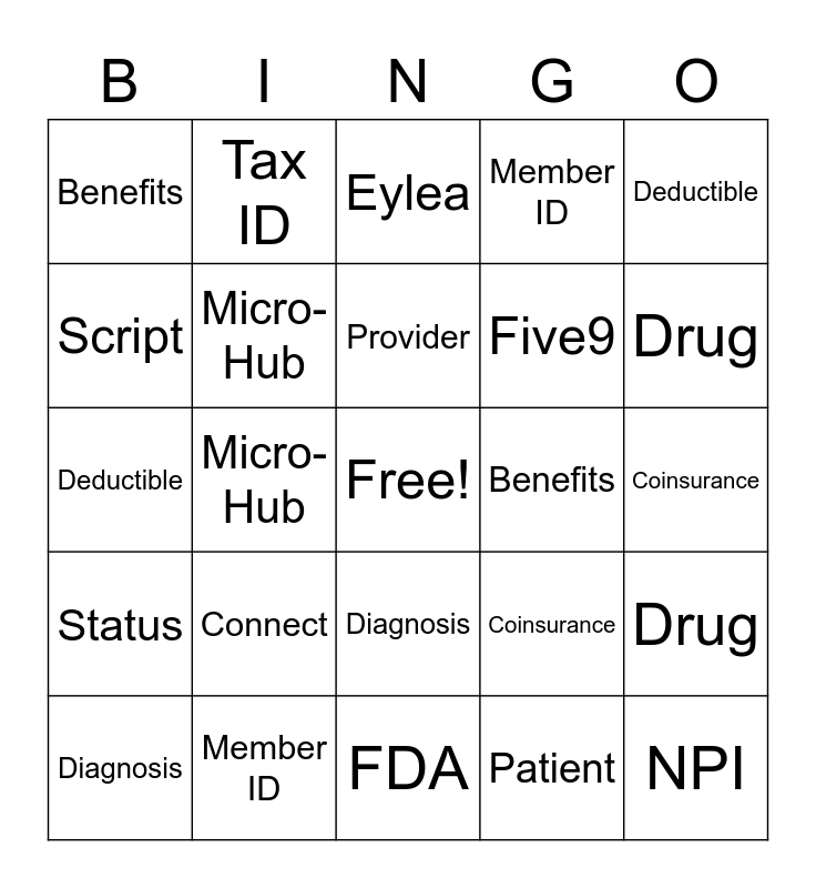This bingo card has a free space and 67 words: Out of Network, In Network, Covered, Drug, CPT, NPI, Tax ID, Non-Covered, Provider, J-Code, Diagnosis, Copay, Coinsurance, Deductible, Out of Pocket, Script, Micro-Hub, Benefits, Eligibility, Five9, Connect, Status, Member ID, Patient, BVS, Out of Network, In Network, Covered, Drug, CPT, NPI, Tax ID, Non-Covered, Provider, J-Code, Diagnosis, Copay, Coinsurance, Deductible, Out of Pocket, Script, Micro-Hub, Benefits, Eligibility, Five9, Connect, Status, Member ID, Patient, BVS, Eylea, Regeneron, Simponi-Aria, Janssen, Braeburn, FDA, Brixadi, Remicade, Charlotte, Dallas, Phoenix, Orlando, Louisville, Pittsburg, Bethesda, Specialty Pharmacy and FDA.
