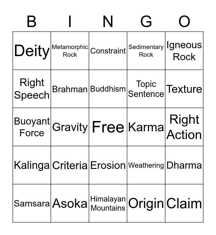 This bingo card has a free space and 24 words: Criteria, Asoka, Buddhism, Samsara, Igneous Rock, Deity, Right Speech, Metamorphic Rock, Karma, Erosion, Topic Sentence, Buoyant Force, Weathering, Dharma, Brahman, Origin, Right Action, Constraint, Texture, Gravity, Claim, Kalinga, Sedimentary Rock and Himalayan Mountains.