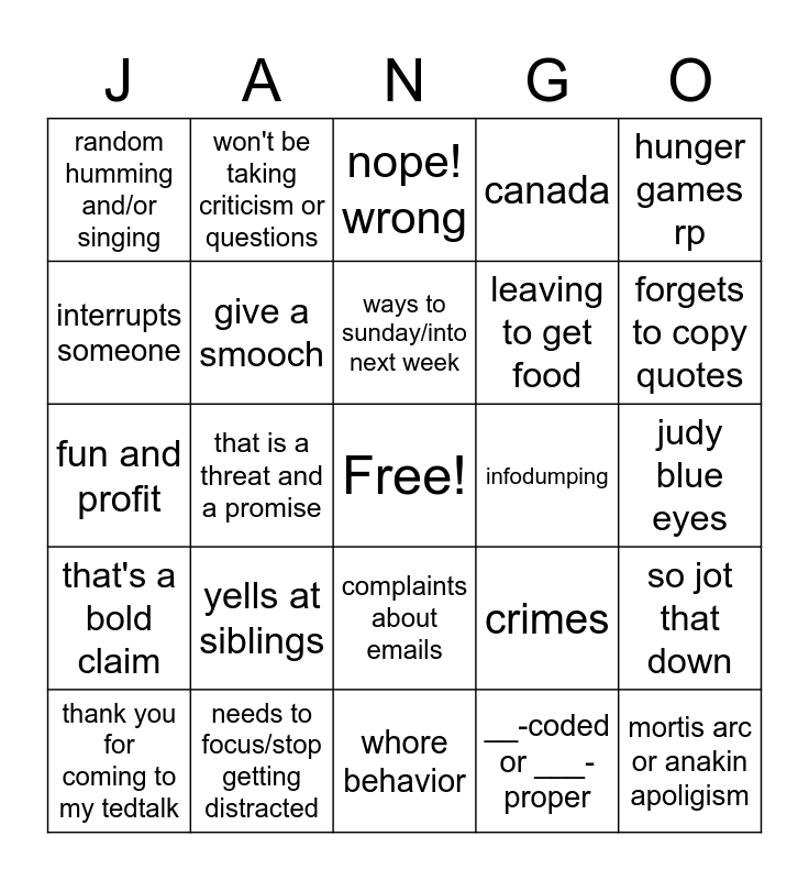 This bingo card has a free space and 24 words: yells at siblings, needs to focus/stop getting distracted, ways to sunday/into next week, thank you for coming to my tedtalk, hunger games rp, random humming and/or singing, interrupts someone, won't be taking criticism or questions, infodumping, complaints about emails, leaving to get food, fun and profit, crimes, so jot that down, give a smooch, __-coded or ___-proper, judy blue eyes, nope! wrong, forgets to copy quotes, that is a threat and a promise, mortis arc or anakin apoligism, that's a bold claim, canada and whore behavior.