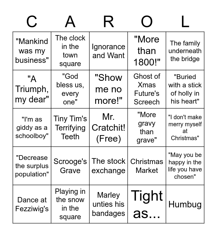 This bingo card has a free space and 29 words: Dance at Fezziwig's, "I'll raise your salary!", Tiny Tim's Terrifying Teeth, The Prize Turkey, "Mankind was my business", Ignorance and Want, "God bless us, every one", Scrooge's Grave, "More gravy than grave", Playing in the snow in the square, "I don't make merry myself at Christmas", Humbug, Marley unties his bandages, Tight as..., "Buried with a stick of holly in his heart", Scary door knocker, The stock exchange, "Decrease the surplus population", The family underneath the bridge, "I'm as giddy as a schoolboy", Christmas Market, The Candle Snuffer, Ghost of Xmas Future's Screech, "A Triumph, my dear", "More than 1800!", The clock in the town square, "May you be happy in the life you have chosen", "Show me no more!" and Marley was dead as a doornail.