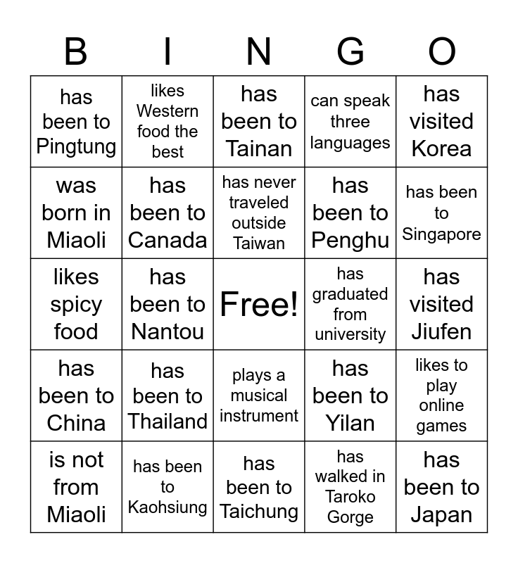 This bingo card has a free space and 29 words: is not from Miaoli, was born in Taipei, has been to Nantou, has been to Europe, has been to Pingtung, has been to Tainan, has been to Canada, has been to Thailand, has graduated from university, has been to Kaohsiung, has visited Jiufen, has been to Japan, has been to Taichung, has walked in Taroko Gorge, has been to Singapore, has graduated from high school, plays a musical instrument, has been to China, has visited Korea, likes spicy food, has been to Yilan, has been to Hualien, has been to Penghu, was born in Miaoli, can speak three languages, likes Western food the best, likes to play online games, has never traveled outside Taiwan and can speak four languages.