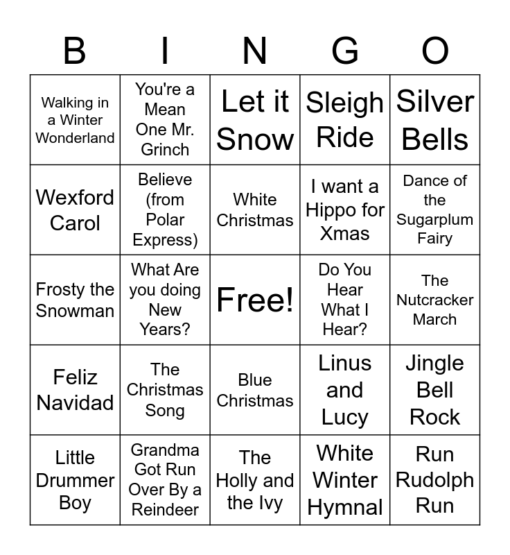 This bingo card has a free space and 28 words: Jingle Bell Rock, Carol of the Bells, I want a Hippo for Xmas, White Winter Hymnal, Wexford Carol, Let it Snow, You're a Mean One Mr. Grinch, Feliz Navidad, Do You Hear What I Hear?, Little Drummer Boy, Frosty the Snowman, Sleigh Ride, Grandma Got Run Over By a Reindeer, The Holly and the Ivy, Dance of the Sugarplum Fairy, Auld Lang Syne, The Christmas Song, Believe (from Polar Express), White Christmas, Blue Christmas, Walking in a Winter Wonderland, Rudolph the Red Nosed Reindeer, Run Rudolph Run, What Are you doing New Years?, The Nutcracker March, Linus and Lucy, Silver Bells and Somewhere in My Memory (Home Alone).