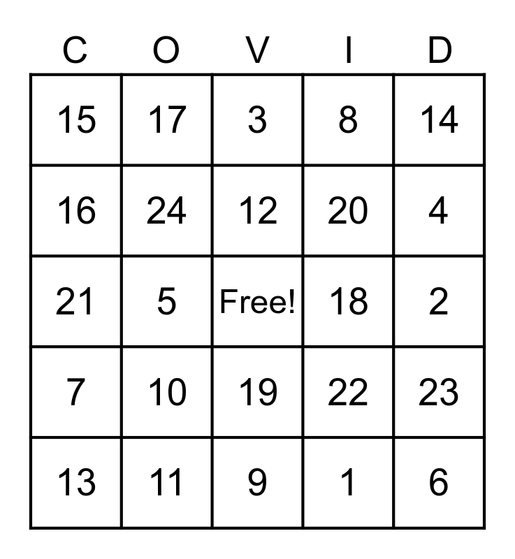 This bingo card has a free space and 24 words: 10, 11, 12, 13, 14, 15, 16, 17, 18, 19, 20, 21, 22, 23, 24, 1, 2, 3, 4, 5, 6, 7, 8 and 9.