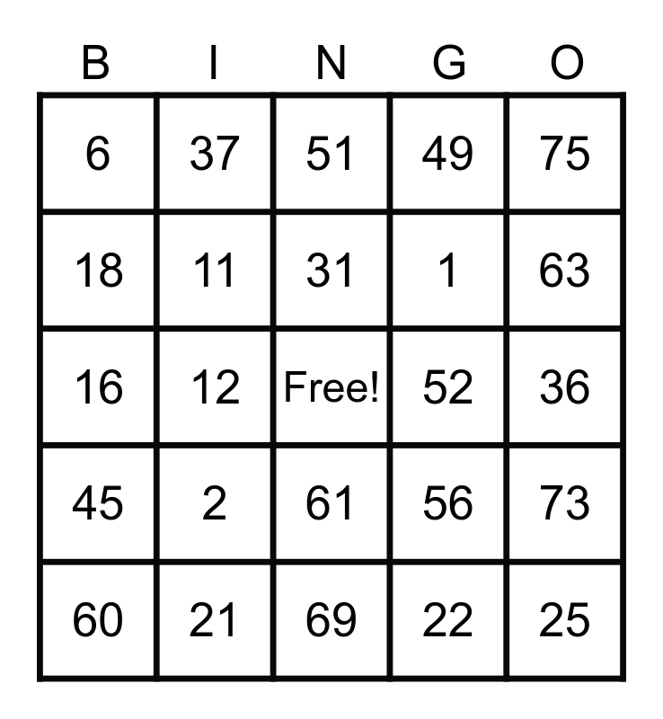 This bingo card has a free space and 24 words: 2, 21, 31, 60, 75, 6, 18, 37, 52, 61, 1, 16, 56, 73, 11, 22, 36, 51, 63, 12, 25, 45, 49 and 69.