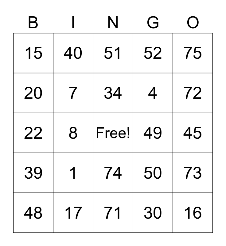 This bingo card has a free space and 24 words: 1, 17, 34, 48, 75, 15, 20, 40, 49, 74, 4, 22, 50, 73, 7, 30, 45, 51, 72, 8, 16, 39, 52 and 71.