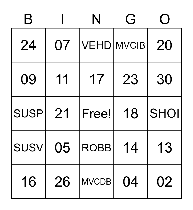 This bingo card has a free space and 53 words: 01, 02, 03, 04, 05, 06, 07, 08, 09, 10, 11, 12, 13, 14, 15, 16, 17, 18, 19, 20, 21, 22, 23, 24, 25, 26, 27, 28, 29, 30, 31, 32, DOMP, DOMV, PCHK, REND, MVCIB, MVCDB, VEHD, VEHP, CMIS, SHOT, SHOI, STAT, LARC, ROBB, DISP, FGHT, SUSP, SUSV, BUTTERNUT ST, JAMES ST and E BRIGHTON AVE.