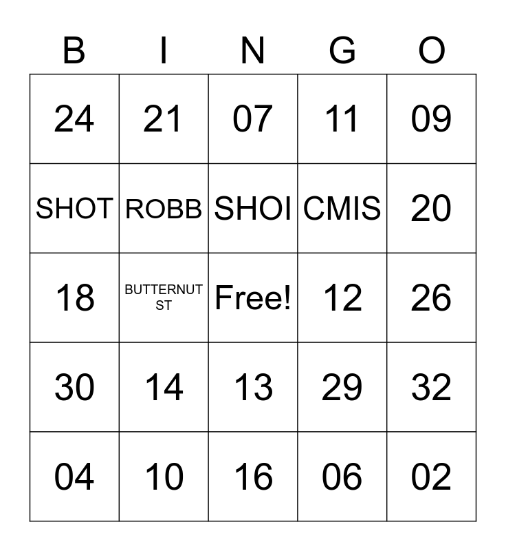 This bingo card has a free space and 44 words: 01, 02, 03, 04, 05, 06, 07, 08, 09, 10, 11, 12, 13, 14, 15, 16, 17, 18, 19, 20, 21, 22, 23, 24, 25, 26, 27, 28, 29, 30, 31, 32, DOMP, DOMV, BUTTERNUT ST, E BRIGHTON AVE, JAMES ST, FGHT, SHOI, SHOT, CMIS, LARC, ROBB and PCHK.