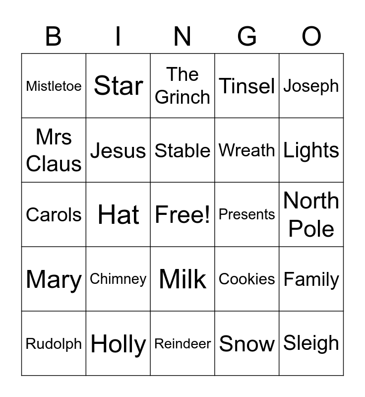 This bingo card has a free space and 34 words: Santa, Snow, Christmas Tree, Angel Gabrielle, Mary, Jesus, Joseph, Rudolph, Star, Wise Men, Stable, The Grinch, Jingle Bells, Elves, Presents, Lights, Holly, Carols, Chimney, Cookies, Milk, Gingerbread, Mistletoe, North Pole, Reindeer, Sleigh, Tinsel, Toys, Wreath, Mrs Claus, Candy cane, Hat, Family and Baubles.