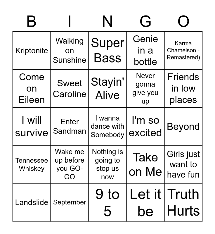 This bingo card has 47 words: Livin' la Vida Loca, I wanna dance with Somebody, I want it that way, 9 to 5, Wake me up before you GO-GO, Africa, Walking on Sunshine, All Star, Come on Eileen, ...Baby one more time, Sweet Caroline, Genie in a bottle, Girls just want to have fun, Take on Me, Hey-Ya!, MMMBop, Stayin' Alive, I'm so excited, You make my dreams (come true), Karma Chamelson - Remastered), Enter Sandman, Let it be, Kriptonite, Never gonna give you up, Despacito - Remix, Friends in low places, Landslide, Johny B. Goods, Nothing is going to stop us now, Tennessee Whiskey, Teenage Dream, Wait for It, Night move, Take me Home, Country Roads, We didn't start the Fire, September, Beyond, In Da Club, Dancing Queen, Call me Maybe, Truth Hurts, Super Bass, I will survive, American Pie, Sweet home Alabama, Livin' On a Prayer and Mambo No.5.