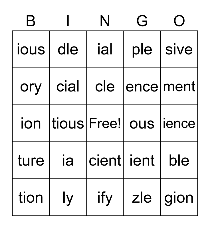 This bingo card has a free space and 29 words: tion, gious, tious, sia, ious, ial, cial, ia, ous, ly, ience, gion, ify, zle, ment, tience, cient, ture, sive, ion, ient, ance, ence, ory, ple, dle, ble, cle and tle.