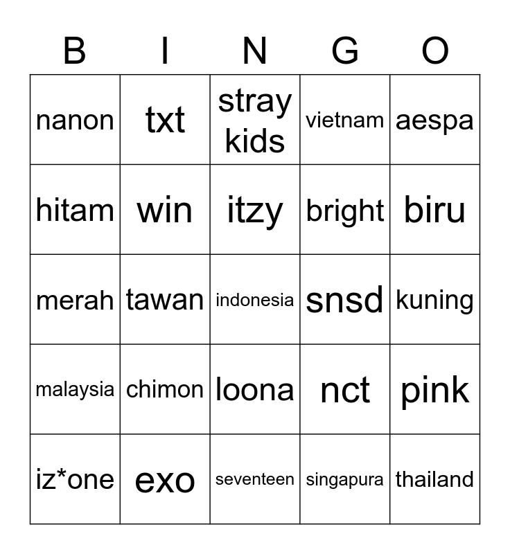 This bingo card has a free space and 24 words: chimon, exo, itzy, iz*one, aespa, nanon, hitam, txt, snsd, loona, bright, merah, nct, pink, win, singapura, kuning, stray kids, biru, tawan, thailand, malaysia, vietnam and seventeen.