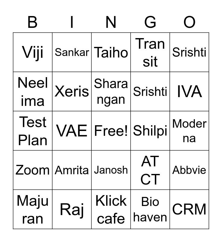 This bingo card has a free space and 24 words: Amrita, Raj, Shara ngan, Maju ran, Srishti, Viji, Neel ima, Sankar, Shilpi, Janosh, Srishti, Test Plan, AT CT, Abbvie, Xeris, Bio haven, Moder na, Taiho, IVA, VAE, CRM, Zoom, Tran sit and Klick cafe.