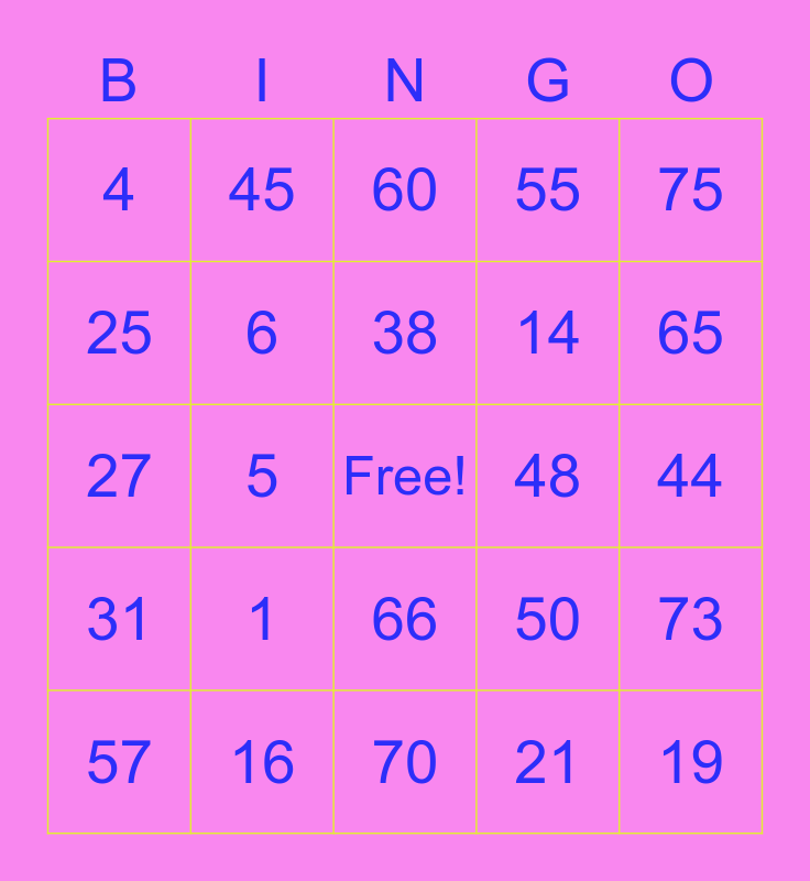 This bingo card has a free space and 24 words: 1, 16, 38, 57, 75, 4, 25, 45, 48, 66, 14, 27, 50, 73, 6, 21, 44, 60, 65, 5, 19, 31, 55 and 70.