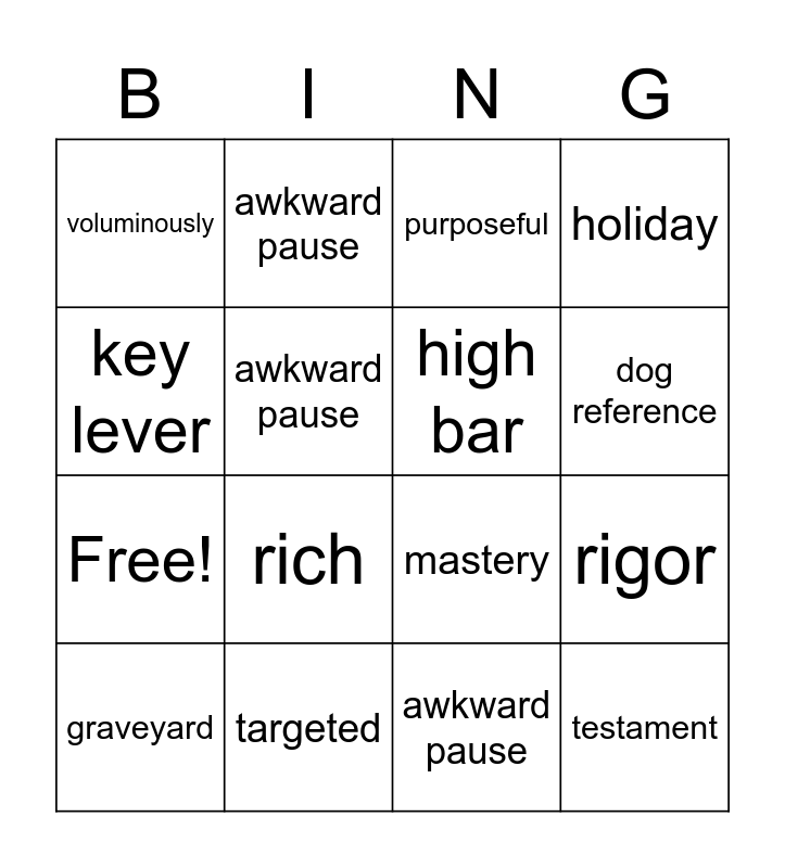 This bingo card has 20 words: rigor, throw things against a wall, purposeful, robust, graveyard, key lever, targeted, voluminously, Free!, awkward pause, rich, mastery, awkward pause, testament, high bar, leaders need to decide, dog reference, holiday, awkward pause and deeply.