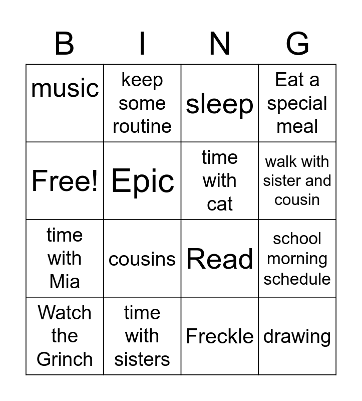 This bingo card has 16 words: time with sisters, school morning schedule, sleep, music, time with Mia, keep some routine, Read, Freckle, Free!, Epic, Watch the Grinch, Eat a special meal, cousins, walk with sister and cousin, time with cat and drawing.