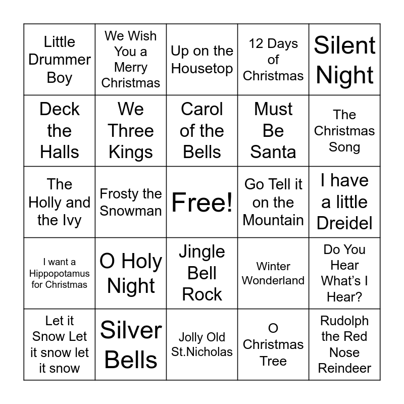 This bingo card has a free space and 26 words: Jingle Bell Rock, O Christmas Tree, Carol of the Bells, Silver Bells, Silent Night, Little Drummer Boy, Deck the Halls, We Wish You a Merry Christmas, I have a little Dreidel, Winter Wonderland, Must Be Santa, The Holly and the Ivy, Do You Hear What’s I Hear?, Let it Snow Let it snow let it snow, Frosty the Snowman, Away in a Manger, 12 Days of Christmas, I want a Hippopotamus for Christmas, Up on the Housetop, Rudolph the Red Nose Reindeer, The Christmas Song, Jolly Old St.Nicholas, Go Tell it on the Mountain, O Holy Night, We Three Kings and Mele Kaliki Maka.