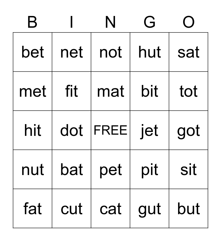 This bingo card has a free space and 25 words: bat, cat, mat, fat, sat, bet, met, net, jet, pet, bit, hit, pit, sit, fit, hot, got, not, tot, dot, but, cut, nut, hut and gut.